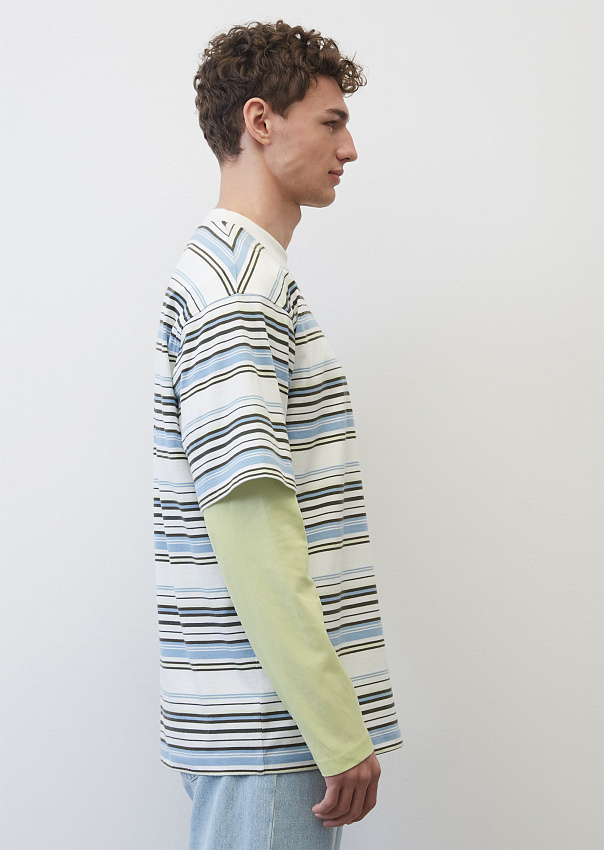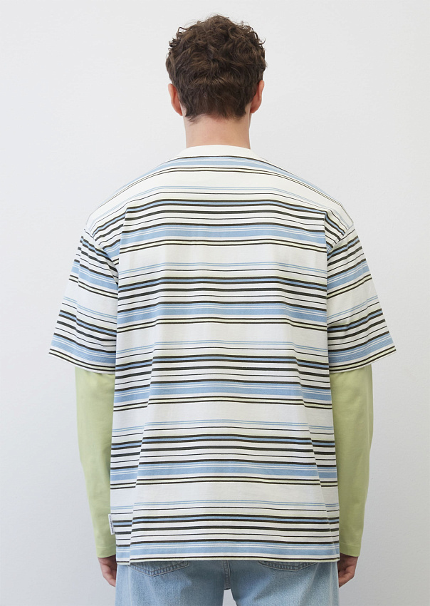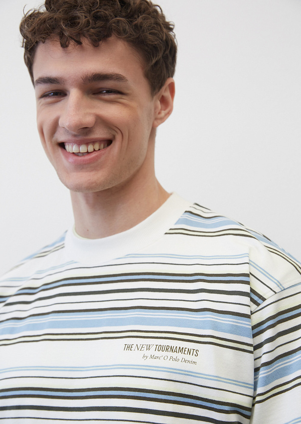 Высококачественная футболка оверсайз изготовлена из удивительно мягкой, легкой трикотажной ткани, состоящей из чистого органического хлопка, сертифицированного GOTS. Футболка в полоску и логотипом на груди. Круглый вырез в мелкий рубчик однотонного цвета, короткие рукава, спущенная линия плечи и прямой подол.