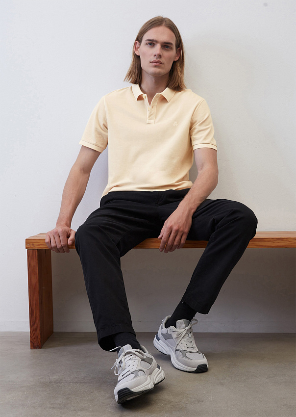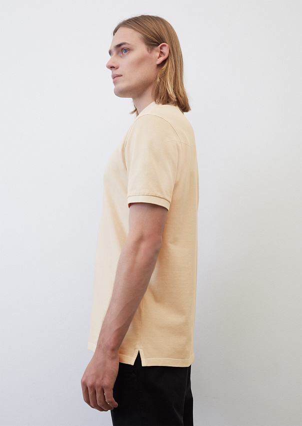 Поло с коротким рукавом выполнено из ткани пике, состоящей из чистого органического хлопка. Классический плоский трикотажный воротник и узкие манжеты рукавов выполнены в рубчик. Модель с прямым подолом и небольшими разрезами по бокам.