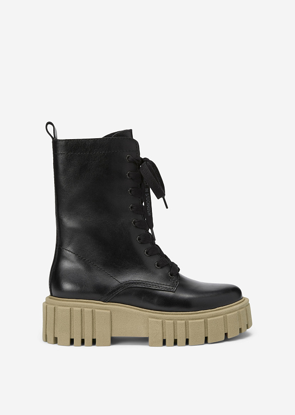 Смелый образ: ботинки из натуральной телячьей кожи, полученной на кожевенных заводах, сертифицированных LWG. Шнурки и металлические люверсы обеспечивают идеальную ширину, а застёжка-молния с внутренней стороны и кожаный язычок сзади позволяют легко надевать и снимать ботинки. Дышащая подкладка из микрофибры и кожаная стелька с пеной с эффектом памяти делают эти ботинки невероятно удобными. Рифлёная подошва из лёгкого материала TR придает им особенный вид.