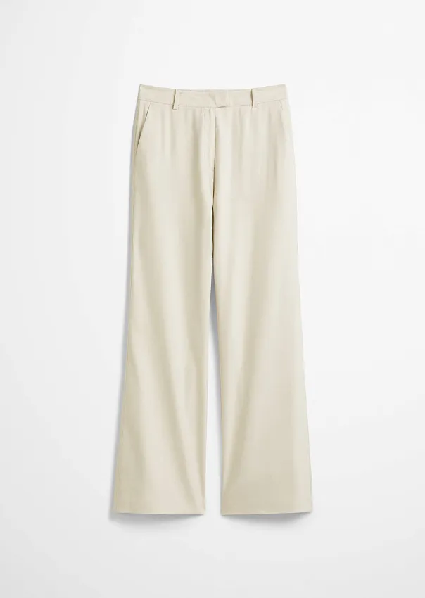 Стильные и универсальные брюки в костюмном стиле – незаменимый предмет летнего гардероба, который идеально сочетается с футболками, топами и блузками. Выполнены из эластичной смеси дышащего льна и ответственно полученной вискозы. Расклешенная модель выстраивает идеальный силуэт и визуально удлиняет ноги. Детали: классический пояс со шлевками для ремня, застежка на крючок и молнию, прорезные боковые карманы спереди и прорезной карман сзади. Непринужденный офисный костюм или элегантный вечерний наряд – брюки дополнят любой модный образ.