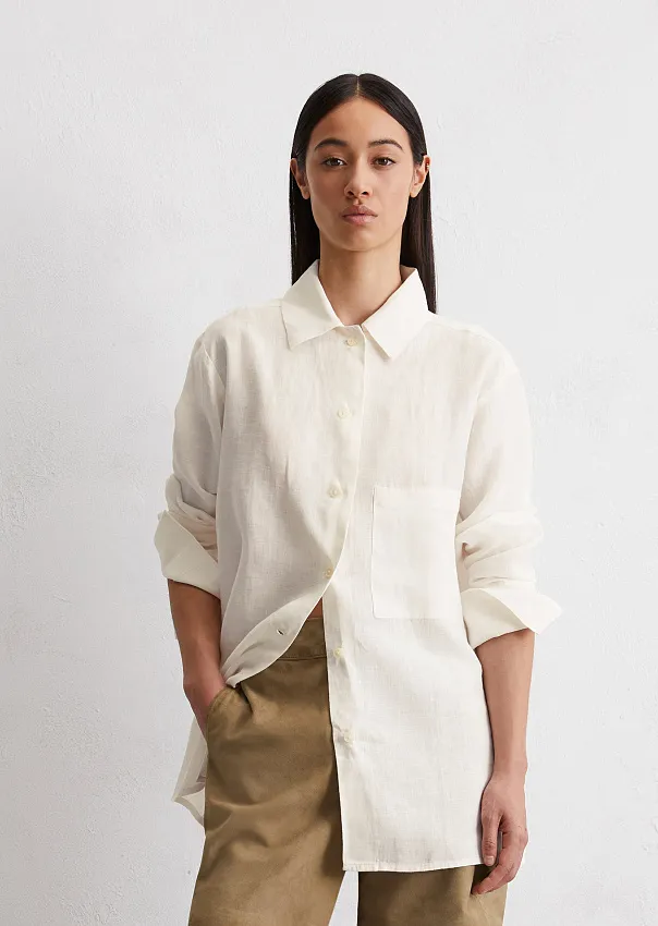 Однотонная льняная рубашка – элегантная классика летнего гардероба. Выполнена из воздушной пряжи, состоящей из чистого льна. Натуральный материал отлично пропускает воздух и обеспечивает неповторимый комфорт. Удлиненная модель свободного кроя с отложным воротником застегивается на пуговицы по всей длине. Длинные рукава дополнены широкими манжетами, а прямой подол – высокими боковыми разрезами на пуговицах. На груди расположен практичный карман. Универсальный предмет гардероба, который отлично подходит как для офиса, так и для отдыха.