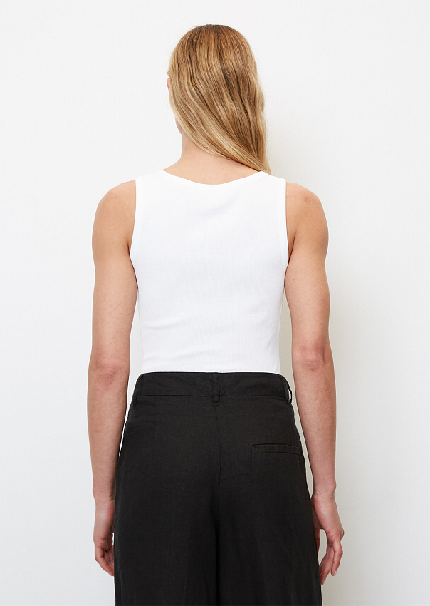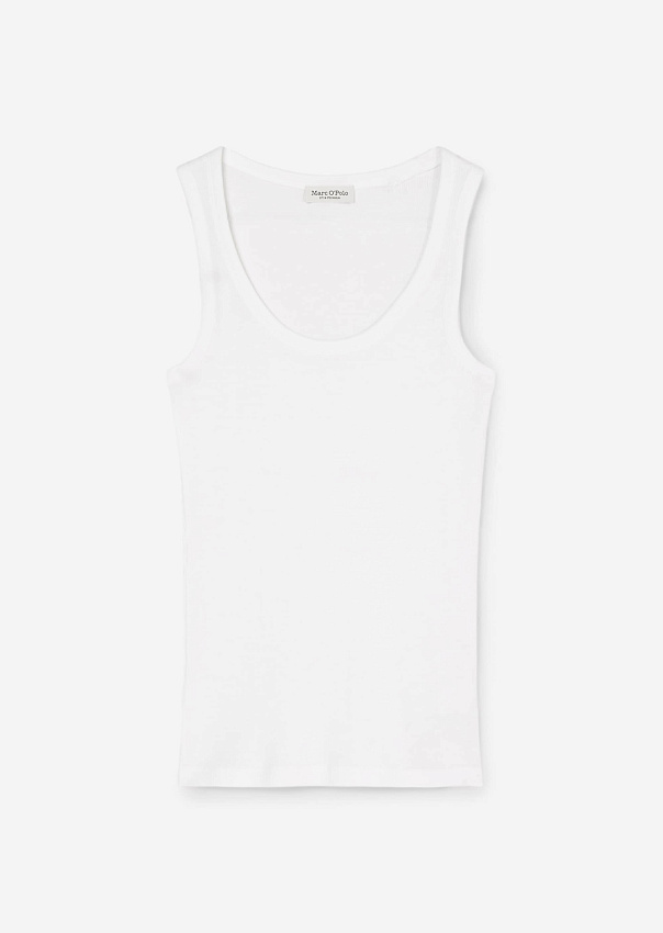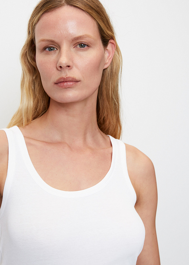 Лаконичная майка выполнена из мягкого джерси, состоящего из чистого органического хлопка. Модель облегающего кроя с глубоким круглым вырезом и широкими бретелями.